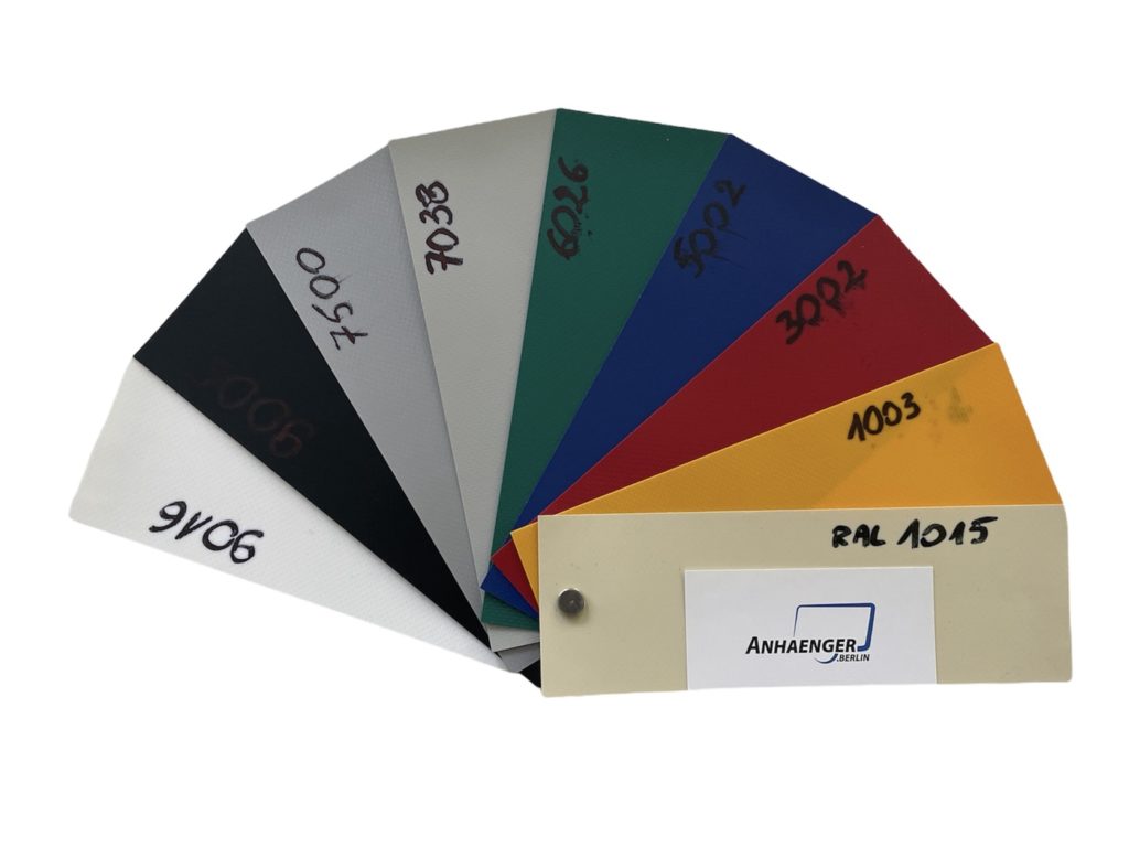 Die Anhänger.Berlin Standard Planenfarbe ist silbergrau RAL7500 mit 680 g, diese versuchen wir immer lagerhaltig für Sie zu haben.